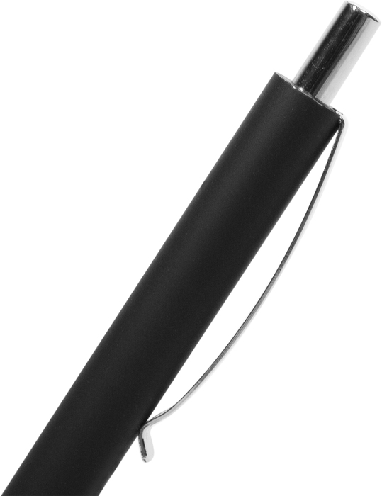 Metal. Cuerpo color negro engomado. Pulsador, clip y punta plata. Tinta negra. Decape plateado