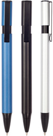 Metal. Formato ovalado. Cuerpo de color. Puntera, clip y pulsador de plástico negro. Pasta azul.