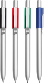 Lápiz Pasta. Metal. Cuerpo metálico plateado. Detalle plástico de color donde engancha el clip y botón pulsador plástico. Pasta azul.