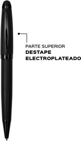 Metal. Cuerpo metálico negro mate. Clip y punta de metal. En la parte de arriba touch. Apertura giratoria. Con estuche. Pasta azul. Destape electroplateado en la parte superior.