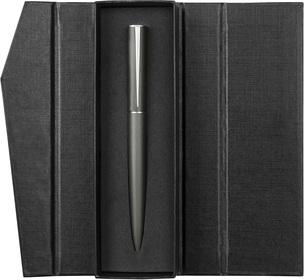 Metálico. Cuerpo color mate. Clip y anillo color plateado. Apertura giratoria. Estuche de cartón. Pasta negra.
