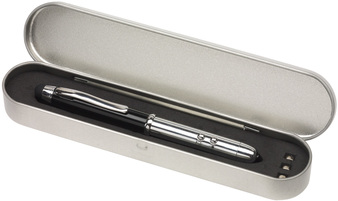 Metálico. Puntero laser, luz LED y punta "touch" para pantallas táctiles. Incluye las baterías más tres baterías de repuesto.