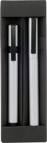 Aluminio. Contiene un Lápiz Pasta y un Roller Ball. Clip metálico en color negro, puntera y aro con detalles plásticos. Pasta negra. Estuche de cartón.