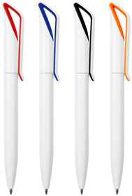 Plástico. Cuerpo color blanco. Clip en su interior con detalle de color. Apertura giratoria. Pasta azul.