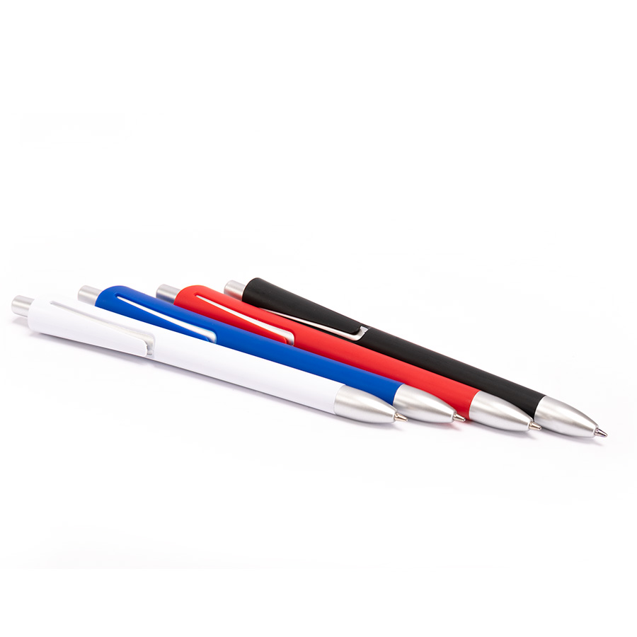Bolígrafo plástico con cuerpo de color mate y terminales plateados. Escritura azul.