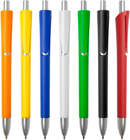 Plástico. Lápiz pasta con cuerpo plástico de color, botón pulsador y puntera color plata. Pasta negra