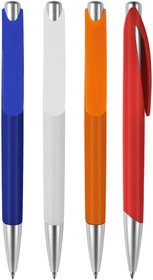 Plástico. Cuerpo de color y detalles de color plata debajo del clip, pulsador y puntera. Pasta azul.
