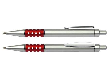 Bolígrafo Plástico Metalizado modelo "Alum", con anillo metálico con orificios. Escritura azul.