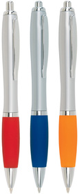 Plástico. Cuerpo curvo, pulsador, clip y puntera color plata. Grip de goma de color. Retráctil. Pasta negra.
