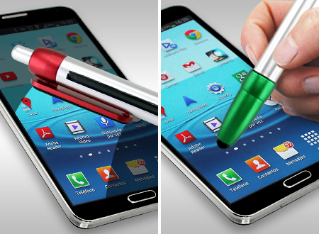 Bolígrafo plástico modelo "Flag", con cuerpo plateado y terminales de color metalizado. Incluye bandera retráctil de tela (para impresión), puntero "Touch-Screen" y clip gamuzado negro para limpiar pantalla táctil. Escritura azul.