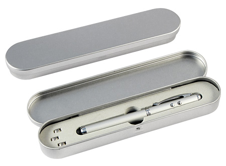 Bolígrafo metálico multi-función 4 en 1. Incluye bolígrafo, linterna LED, puntero láser y NUEVO puntero "Touch-Screen" para pantallas táctiles. Presentación en estuche de aluminio. Escritura Azul.