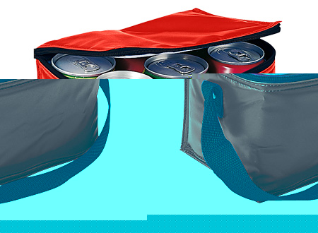 Cooler para 6 latas de bebidas o cervezas, también utilizable como lonchera. Tela exterior 420D/PVC Poliéster. Tela interior PVC metalizado aislante.