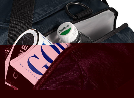 Bolso viaje-deportivo tela impermeable polyester 840D, interior reforzado EVA, 2 bolsillos laterales, 1 bolsillo frontal, compartimento para zapatos, cinta de colgar con hombrera acolchada y cordón elástico multiuso.