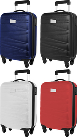 55 x 35 x 20 cm. Capacidad 38 litros. ABS. 4 ruedas con giro 360°. Manilla de transporte reforzada. Mango extensible hasta 54 cm. 2 posiciones. Interior: 2 compartimentos principales con cierre y elásticos ajustables. Placa metálica desmontable para grabado (medida: 6 x 4 cm.) Candado incluido con combinación.