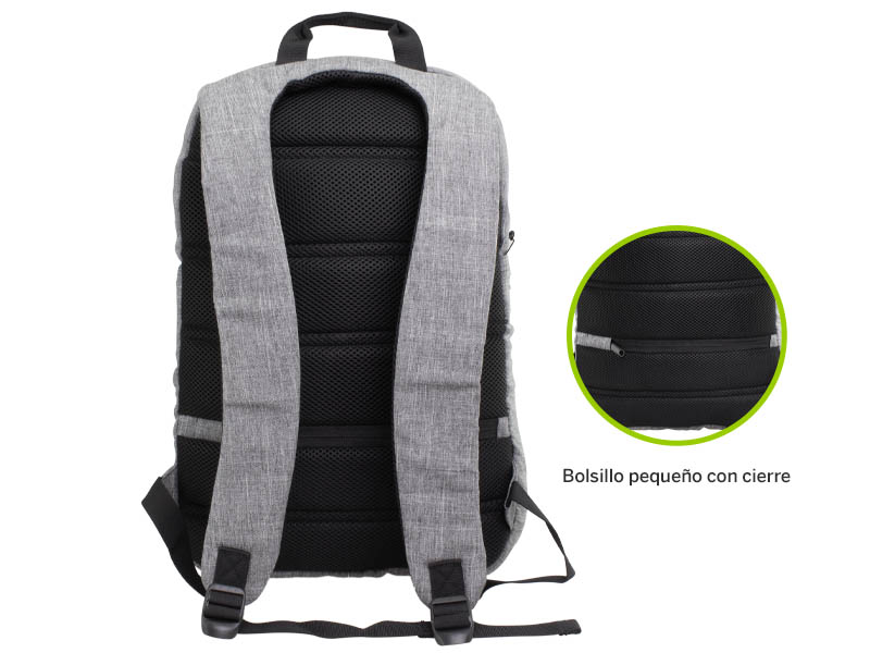 Mochila Porta-Notebook modelo "Norway". Tela PU 600D Two-Tone impermeable. Capacidad 9 litros, tamaño 29 x 45 x 7 cm. Incluye compartimento interior reforzado y acolchado para Laptop. Bolsillos interiores y delantero.