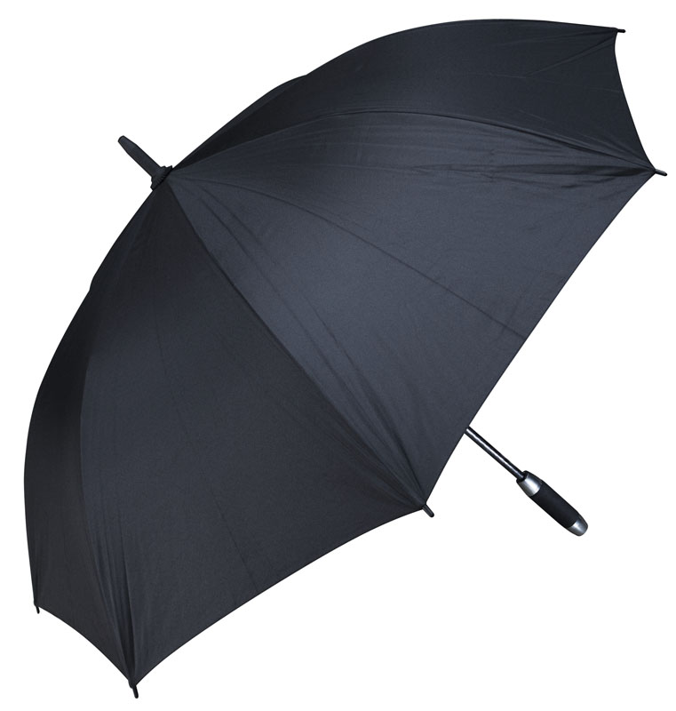 Deluxe Paraguas de Golf con 8 cascos de tela 190T PONGEE reverso cobertura plateada con protección UV. Cuerpo y varas reforzadas de Fibra de Vidrio, sistema de apertura automático. Mango recto de EVA negro y aluminio anodizado. Incluye funda al tono de 190T PONGEE.