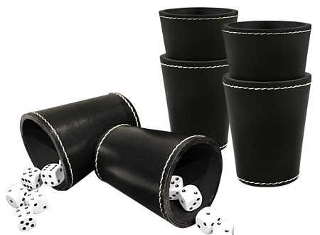 Set de 6 cachos de PU negro, presentados en bolsa ecológica negra. Incluye 30 dados blancos (5 dados por cada cacho).