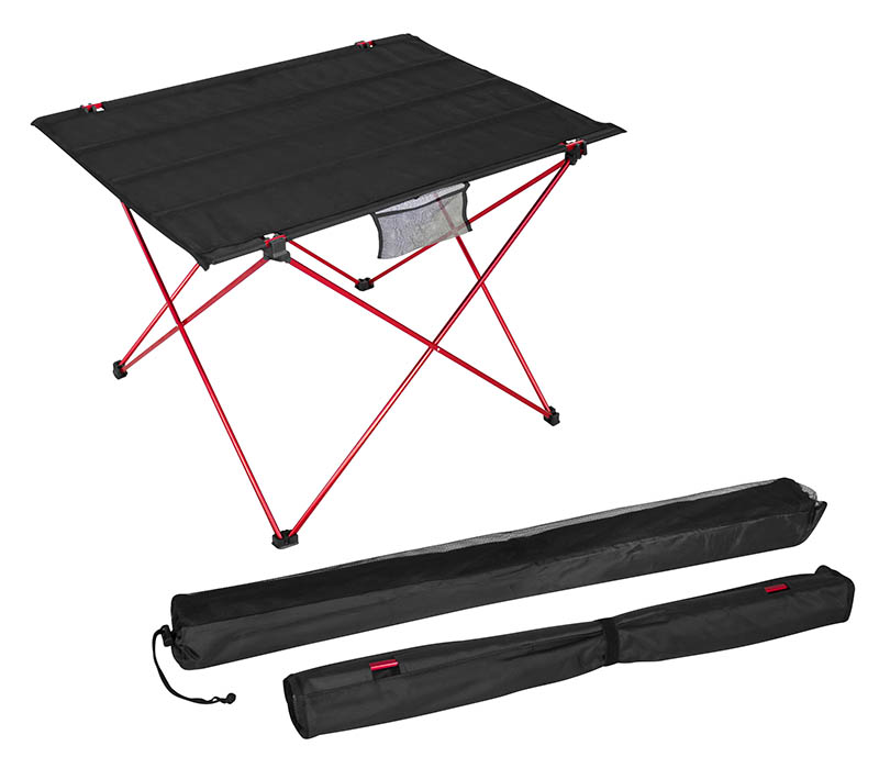 Mesita plegable de Picnic. Estructura base plegable y desarmable de aluminio color rojo, cubierta plegable en tela Oxford 600D color negro. Incluye 2 bolsillos de malla para accesorios. Ideal para llevar de picnic o a actividades al aire libre. Es muy liviana, pesa sólo 1 kg. y como es plegable y desarmable, ocupa muy poco espacio, se guarda dentro de un bolsito (incluido) de sólo 100 x 12.7cm