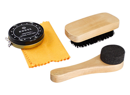 Set de Limpieza de Calzado en Estuche de tela negra. Incluye pasta de zapato color neutro, paño amarillo, esponja y escobilla. Presentación en elegante Estuche barnizado negro.