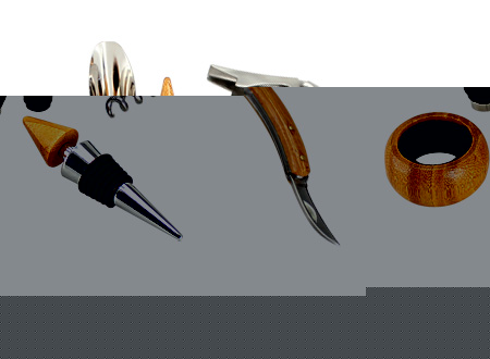 Deluxe Set de 4 accesorios para el vino, en caja 100% madera Bamboo, con cierre mosquetón envejecido. Serigrafía, Grabado Láser.