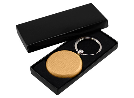 Llavero Redondo de Madera de Bamboo. Presentación en estuche laminado negro con cuna aterciopelada. Serigrafía, Grabado Láser.