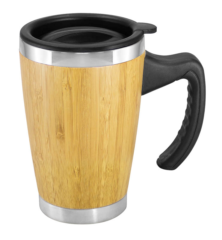 Mug de madera de Bamboo con asa plástica negra, interior de Acero Inoxidable. Tapa plástica negra con dosificador. Presentación en caja de cartón forrado natural.