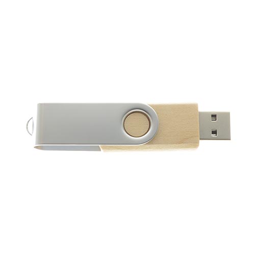 Pendrive madera, tapa giratoria metálica, empaque plástico individual.