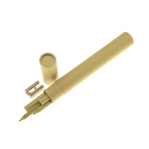 Tubo de cartón, incluye dos bolígrafos grafitos, dos bolígrafos de pasta negra y un sacapuntas.
