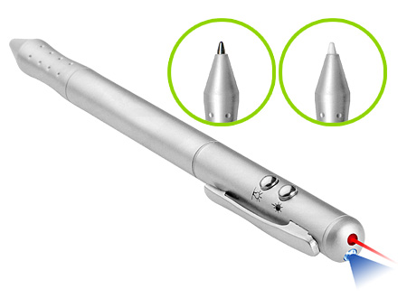 Bolígrafo metálico multi-función 4 en 1. Incluye bolígrafo, linterna LED, puntero láser y puntero PDA (Palm). Presentación en estuche de aluminio. Escritura Azul.