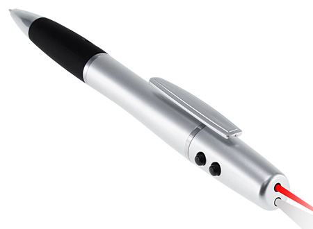 Bolígrafo plástico multi-función 3 en 1. Incluye bolígrafo, linterna LED y puntero láser. Escritura negra. Presentación en estuche metálico y caja plateada de cartón.