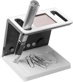 8 x 8 cm. Plástico. Reloj solar y porta lápices. Reloj, alarma, temporizador, fecha, día y temperatura. Sin la luz solar cambia automaticamente y funciona con una batería botón. Dos compartimentos para lápices pasta y espacio imantado para guardar clips. Se convierte en tarjetero cuando se desmonta el reloj.