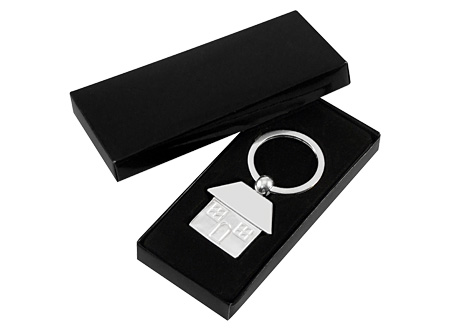 Llavero Metálico Casa, con reverso liso. Presentación en estuche laminado negro con cuna aterciopelada.