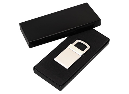 Llavero Metálico modelo "Lock". Presentación en estuche laminado negro con cuna aterciopelada.
