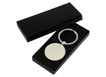Llavero Metálico Redondo Plano. Presentación en estuche laminado negro con cuna aterciopelada.