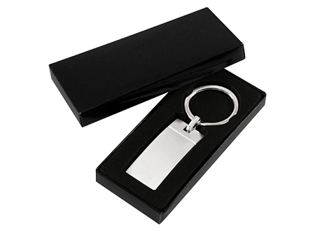 Llavero Metálico satinado, modelo "Wave". Presentación en estuche laminado negro con cuna aterciopelada.