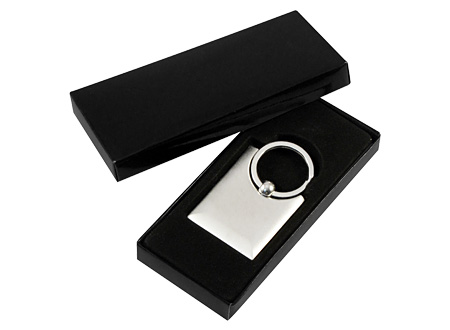 Llavero Metálico satinado, modelo "Bag". Presentación en estuche laminado negro con cuna aterciopelada.