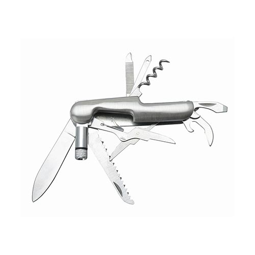 Llavero metálico tipo herramienta multipropósito, incluye; tijeras, cuchilla, sierra, destapador, linterna led, destornillador de cruz y paleta, saca corchos, lima y abre latas. Empaque en caja plateada.