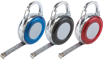 6,6 x 4,7 x 1,8cm. Metal y plástico. Largo 2m. Robusta tapa de acero. Escala de medida en cm y pulgadas. Mosqueton para sujetar a la cintura.