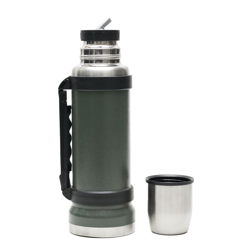 Descripción general del producto: Termo de acero inoxidable 304, recubierto con esmalte especial que protege de ralladuras y golpes. Puede mantener el contenido a la misma temperatura durante 18hs, gracias a su doble pared aislante especial de acero. Cuenta con un tapón cebador Hermético a rosca con la función anti derrame y tapa con superficie plana estable para usar como taza o vaso y manija plegable para facilitar el transporte. Presentado en caja de cartón. Medidas del termo: 34 cm x 10,5 cm. Medidas de la caja: 35 x 11 x 11 cm. Capacidad: 1,1 Lts. Tahg.