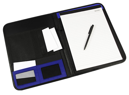 Carpeta de PU/PVC. En el interior incluye Block de 30 hojas lineadas tamaño A4, Bolígrafo negro a pasta, Bolsillos para documentos tamaño A4, Bolsillos de tela TNT y Compartimentos para Tarjetas.