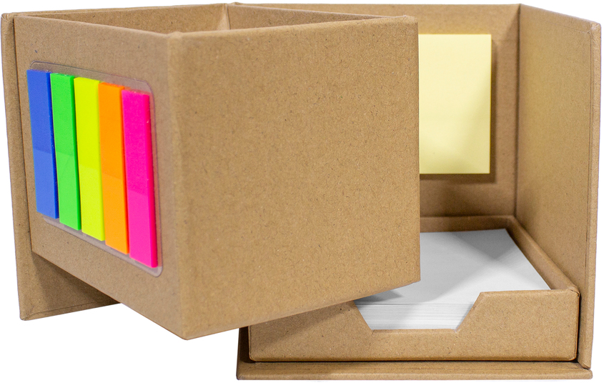 10 x 10 x 10 cm. Cartón. Porta Lápiz con post-it de tiras en diferentes colores flour en el frente, empujando hacia fuera block rectangular con autoadhesivos color amarillo y en la parte inferior un contenedor con hojas blancas de 7,4 x 8,7 cm.
