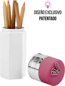 Ø 7 x 18,5 cm. Plástico. Porta lápices en forma de lápiz. Incluye clips metálicos. La parte superior de la tapa es imantada para adherir los clips. Diseño exclusivo patentado.