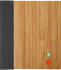 12 x 10,5 x 2 cm. Bambú. Contiene un block adhesivo rectangular de papel reciclado, un block adhesivo pequeño de color y 3 blocks en forma de flecha. El exterior del estuche es de bambú con detalles de tela, el interior es de plástico con divisiones.