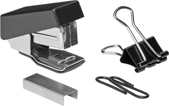 9,5 x 6 x 2 cm. Plástico. Set de 1 corchetera. Repuestos de corchetes. Clips plásticos de color. 2 Sujeta papeles. Caja plástica transparente.