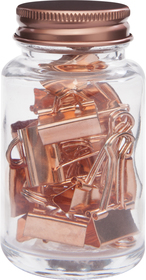 Ø 4,5 x 8,5 cm. Vidrio y metal. Set de sujeta papeles metálicos en frasco de vidrio con tapa metálica.