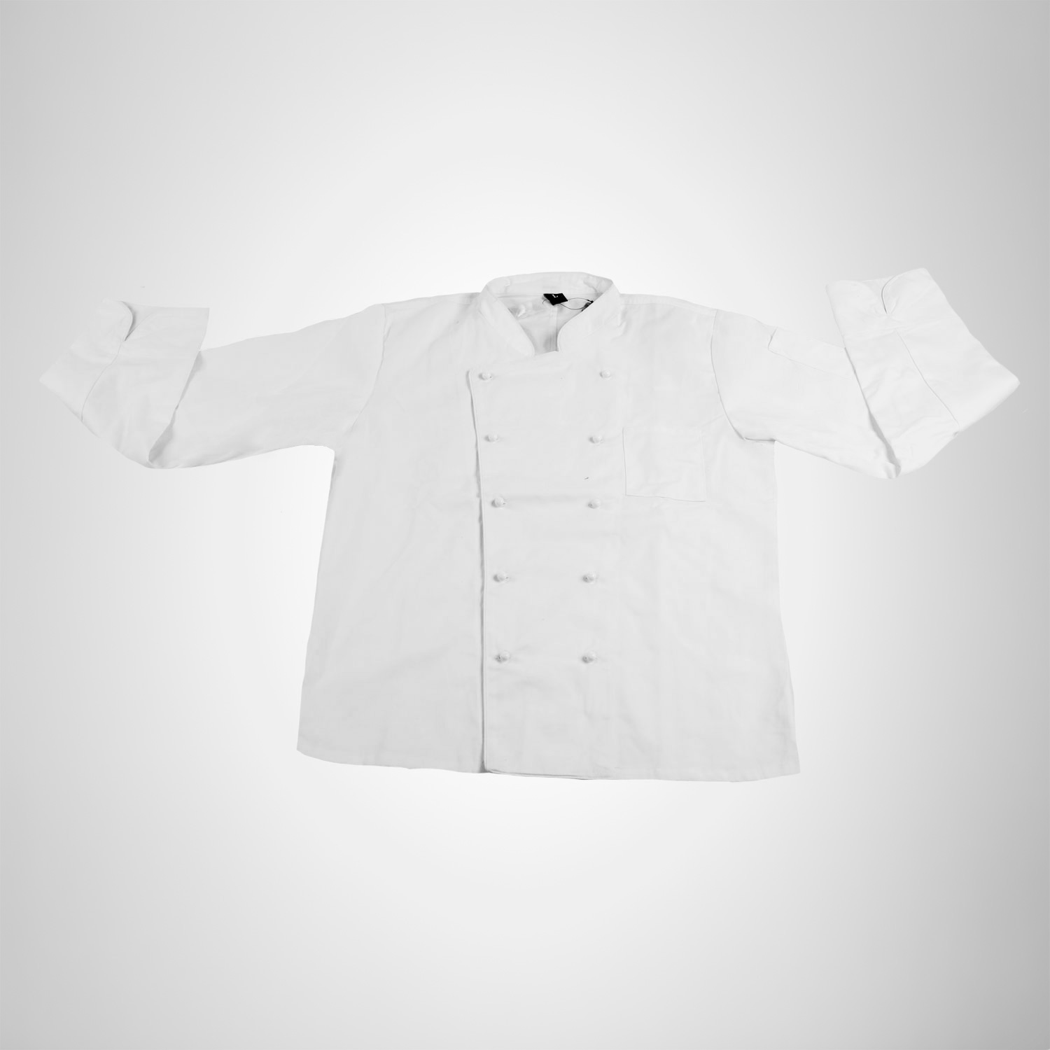 Chaqueta cuello mao, cruce con 10 botones de seguridad, 2 pinzas de entalle frente y espalda, manga 3/4 con tajalí, bolsillo parche en manga izquierda y delantero para accesorios gastronómicos, entallada.