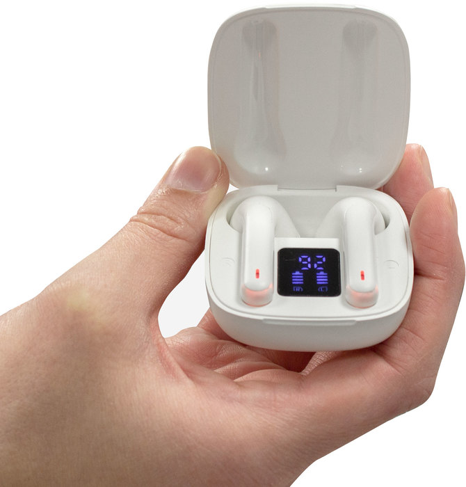 5,5 cm x 5 cm x 2,5 cm. (medida de la caja) 45 mm (auriculares). Plástico ABS. Auriculares bluetooth con imán, se conectan al celular de forma inalámbrica. Los auriculares cuentan con función touch en cada costado de los audifonos (izquierdo y derecho) para funciones de encendido, apagado, avance, retroceso, reproducción y pausar musica. Así como también para las funciones de responder, rechazar o finalizar una llamada. Estuche que permite cargar la batería de los auriculares. Indicador de batería del estuche. Base de carga 300 MAH . Auriculares: 30mAh Bluetooth V5.0. Rango de alcance 10 metros. Tiempo de reproduccion autónomo 3 horas aprox. Tiempo de carga de la batería 1 hora. Cable de carga USB tipo C. Duración de la batería en modo stand by: 40 hs. Presentación en caja de regalo.