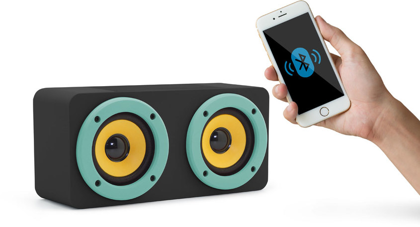 Parlante Bluetooth + MIA. Conexión de dispositivos por Bluetooth, cable o a través del sistema MIA (amplificación por inducción magnética) con sólo apoyar un dispositivo sobre el recuadro superior se amplifica la música. Plástico. 23 x 11 x 9 cm. Batería incorporada Carga por USB (cable de 1m incluído).