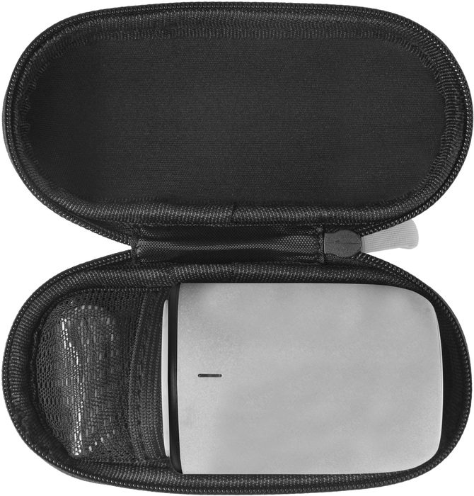 4,5 x 7 cm. (aprox). Plástico engomado. Mini parlante/bocina. En la base: goma antideslizante, interruptor de encendido y apagado, botón de reproducción/pausa, respuesta y finalización de llamada. Luz led que indica carga, conexión a bluetooth y escuchar música. Micrófono que permite realizar llamadas. En uno de sus costados entrada para audífonos/auriculares y puerto USB para su carga. Estuche con cierre en su interior un pequeño bolsillo de red. Incluye cable de carga USB y de audio.