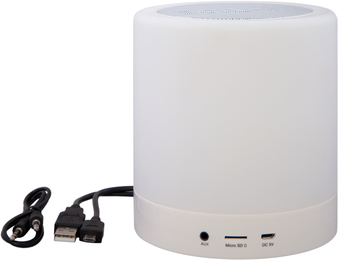 Ø 12 x 13 cm. Plástico. Bocina bluetooth para reproductores de MP3, smartphone, Iphone y tarjeta TF. Luz con tres niveles de intensidad con encendido táctil en la parte superior. Función manos libres. Potencia musical de 5 Watt. Botón de play, avance y retroceso. Cable de audio y cable Micro USB de 72 cm aprox. Incluye manual.
